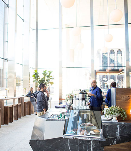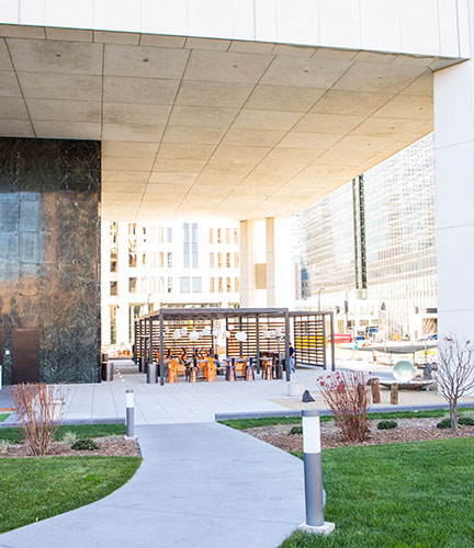 The 100 Washington Square building was designed by Minoru Yamasaki (World Trade Center fame) and completed in 1981. The building has 22 floors with an open base. The lower two floors are an open plaza with the building supported at the four corners and center elevator core. The owner embarked on an improvement plan to correct several long overdue waterproofing projects and enhancements to update the underutilized lobby and plaza area.