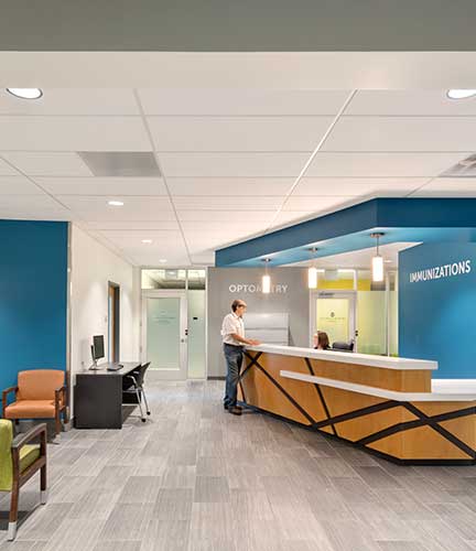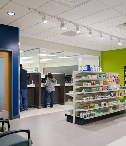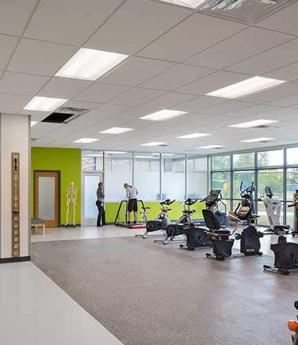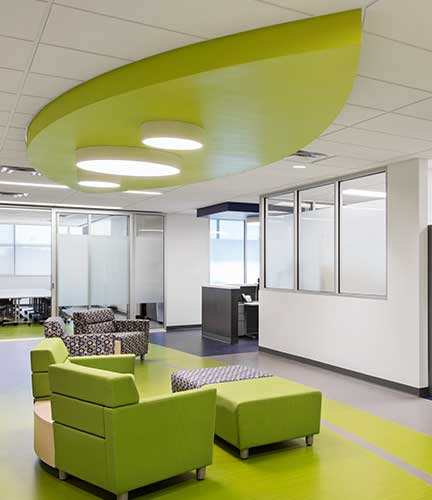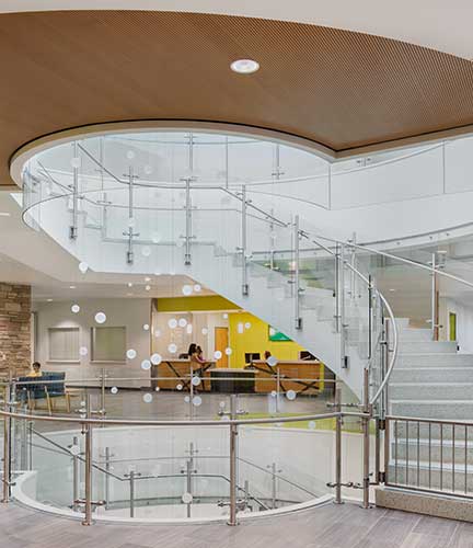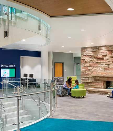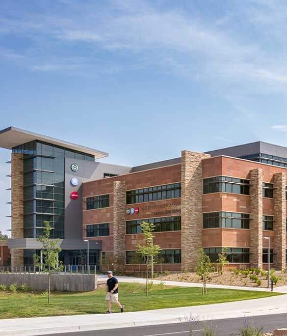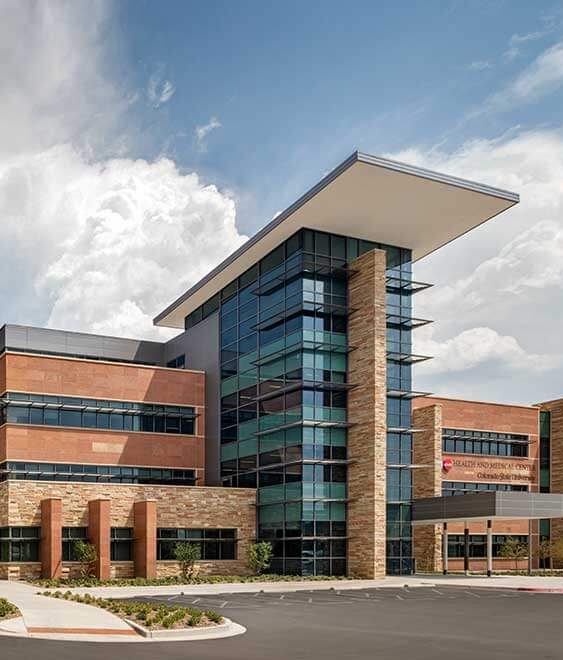Sitting on the northwest corner of South College Avenue and West Prospect Road, the 161,200-sf, four-story building stands as a prominent new gateway to the campus, while consolidating the University’s health care services into one location. The building also houses a University of Colorado Health walk-in clinic, the Kendall Anderson Nutrition Center, and an occupational health services clinic alongside a full service pharmacy on the first floor, all of which are open to the general public. In addition, the Columbine Health Systems Center for Healthy Aging has space in the facility for research, education, and outreach.