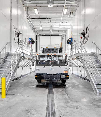 The East Side Storage and Maintenance Facility project provides the City of Minneapolis vehicle storage and maintenance as well as related offices. The facility and site provide for additional City vehicle storage and maintenance, warehouse storage and office needs. A fuel canopy/gas station, wash bay, and more covered storage as well as a big steel art feature on the SW corner of the site. Part of the main building assembly is a four-story parking ramp.